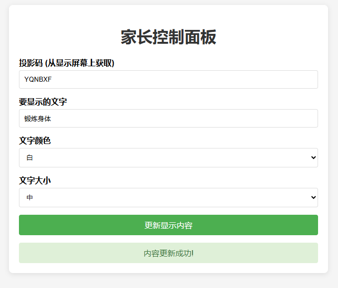 小朋友做语文作业,经常会问这个字怎么写,这个字还可以组成什么字。找了一个工具,将汉字输入进去,在手机上可以以比较大的字体显示出来,这样他即使离我较远,他也可以看得较清楚,也不用占用我的电脑屏幕。后面,又想着,可以不用我分心在手机上操作,毕竟手机上打字不方便,经常切换也费时,于是想了个办法,做了一个控制端,将原来在手机上投影的页面做成被控端,这样手机上打开网页后,我在电脑这边儿的控制端,就根据唯一的投影码就改变远程手机屏幕上的投影文字了。